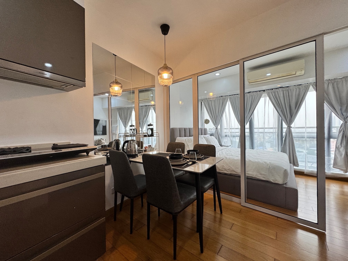 Estúdio tranquilo e sofisticado na vibrante Century City de Makati. Ideal para nómadas digitais e viajantes exigentes: Wi-Fi de 500+ Mbps, espaço de trabalho, produtos de banho de argão marroquino, roupa de cama premium e kitchenette abastecida. Ginásio de luxo, jacuzzi quente e piscina aquecida. Caminhe sem esforço para a vida noturna de Poblacion, Century Mall, cafés e mercearias. Torre moderna, limpa, segura e privada. Check-in autónomo com fechadura inteligente e anfitriões responsivos e atenciosos. O seu oásis urbano tranquilo no centro da melhor gastronomia e vida noturna de Makati.