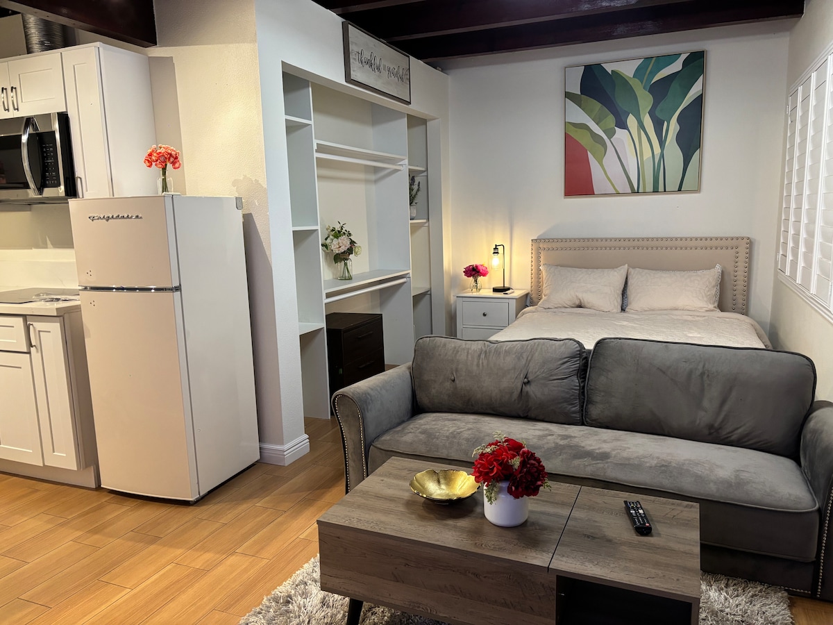 Enjoy a newly renovated in-law suite, complete with a private entrance, full bath, kitchenette, memory foam queen bed, and a private patio with seating. There is also a sleeper couch available to you. Conveniently located to airports, amusement parks, beaches, hiking & biking. LAX Airport 25 miles Santa Ana Airport 15 miles Disneyland 6.5 miles Knott's Berry Farm 1.5 miles Beaches 9 miles Parking available on the street The suite is 350 square feet of living space with two shared walls.