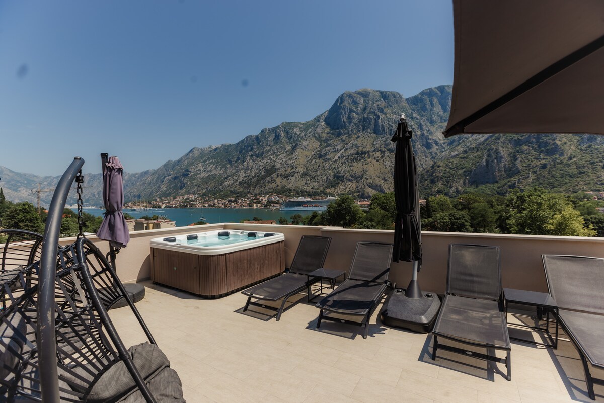 Situado em Kotor, a 2,5 km da entrada principal da cidade velha, o apartamento oferece acomodação com acesso Wi-Fi gratuito, ar condicionado, estacionamento gratuito, jardim e churrasqueira. O apartamento tem quarto e uma sala de estar com sofá-cama reversível, uma TV de tela plana com canais via satélite e cozinha equipada com geladeira e forno, uma máquina de lavar roupa e banheiro com chuveiro. O apartamento tem um terraço e uma incrível vista para o mar e para a cidade velha. Do estacionamento ao apartamento há cerca de 50 escadas.