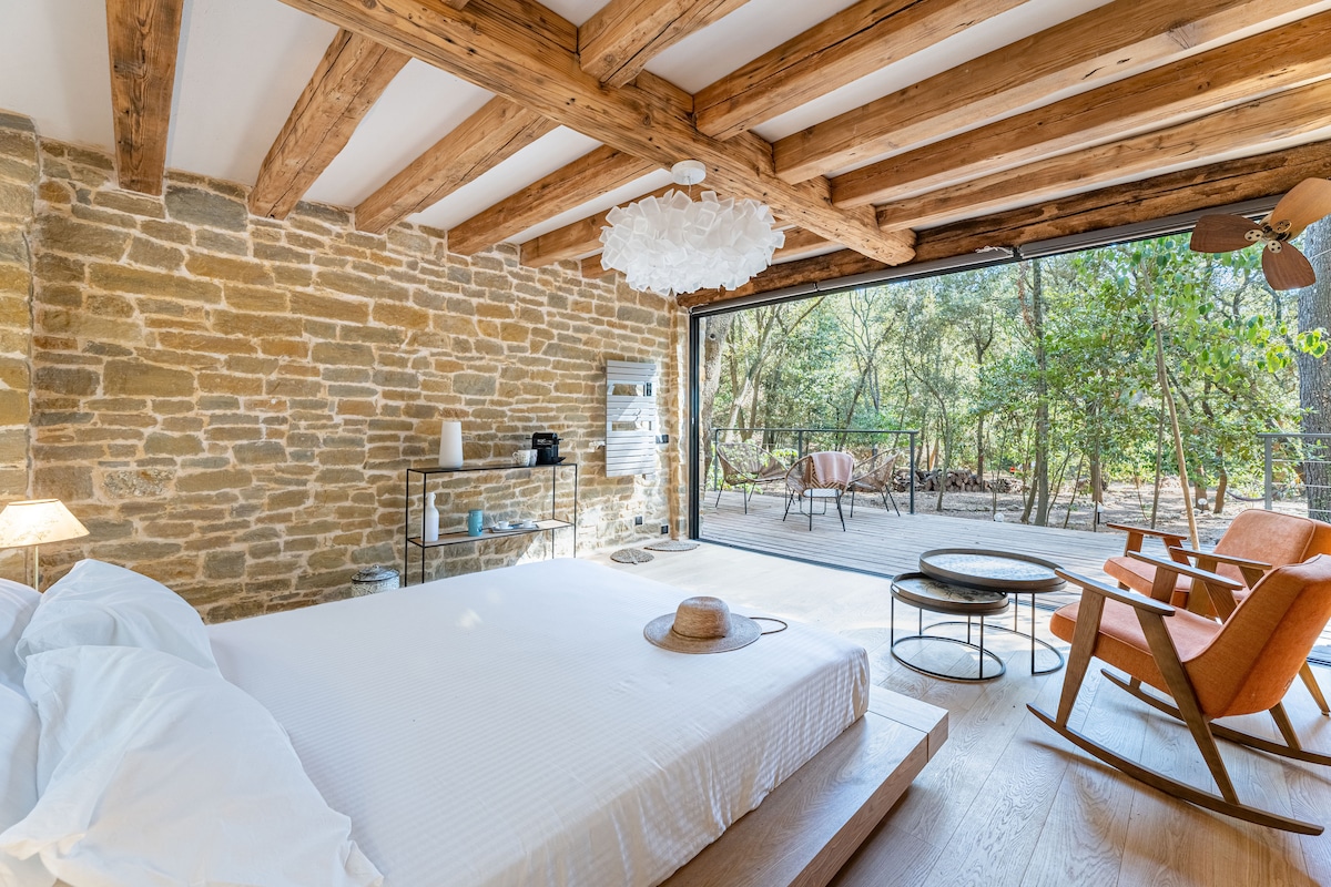 We are delighted to welcome you in our "Renardière", a cottage of stones and glass, crossed by the forest. Guest house restored with passion, it will offer you a superb stay in the middle of nature and a few minutes from the beaches. Independent of our house, you will have a large room in country stones and exposed beams, a beautiful bathroom with walk-in shower and a large terrace with its SPA. Attention: it’s a no-smoking area