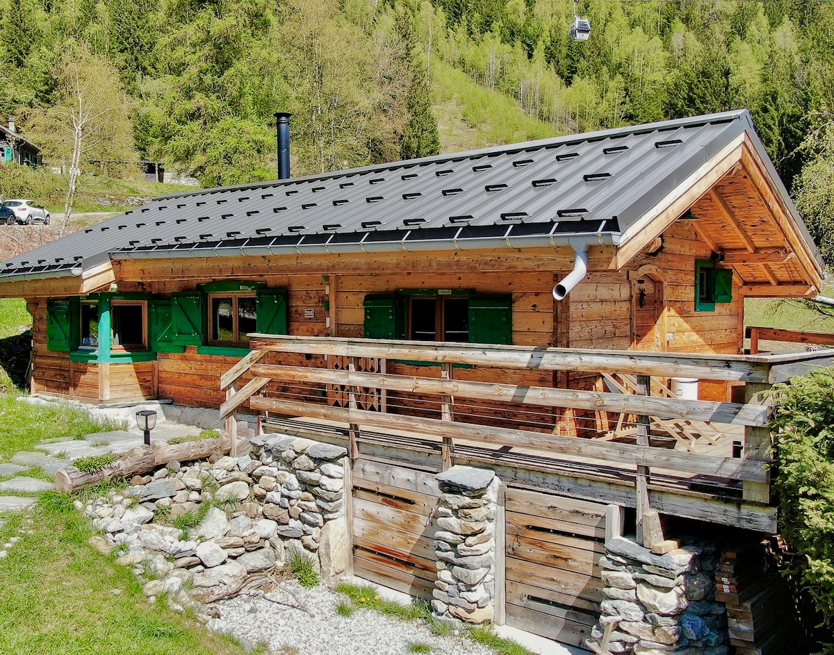Charmoso chalé antigo de madeira e pedra com vista para o Mont Blanc
