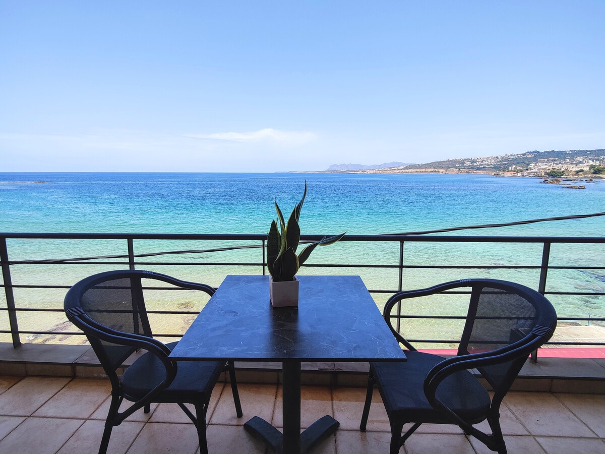 O loft está localizado bem na Praia Pública de Chrissi Akti (Praia Dourada), uma das melhores praias perto de Chania (4 km, 8 min), acessível também de ônibus. Oferece uma vista incrível para o mar. A praia fica literalmente em frente ao edifício. Há estacionamento gratuito na rua do lado de fora. O apartamento é complementado com uma enorme varanda privativa, onde você pode passar a maior parte do seu tempo quando não estiver na praia, e uma sala separada para lavanderia e armazenamento. É adequado para famílias com crianças/bebês.