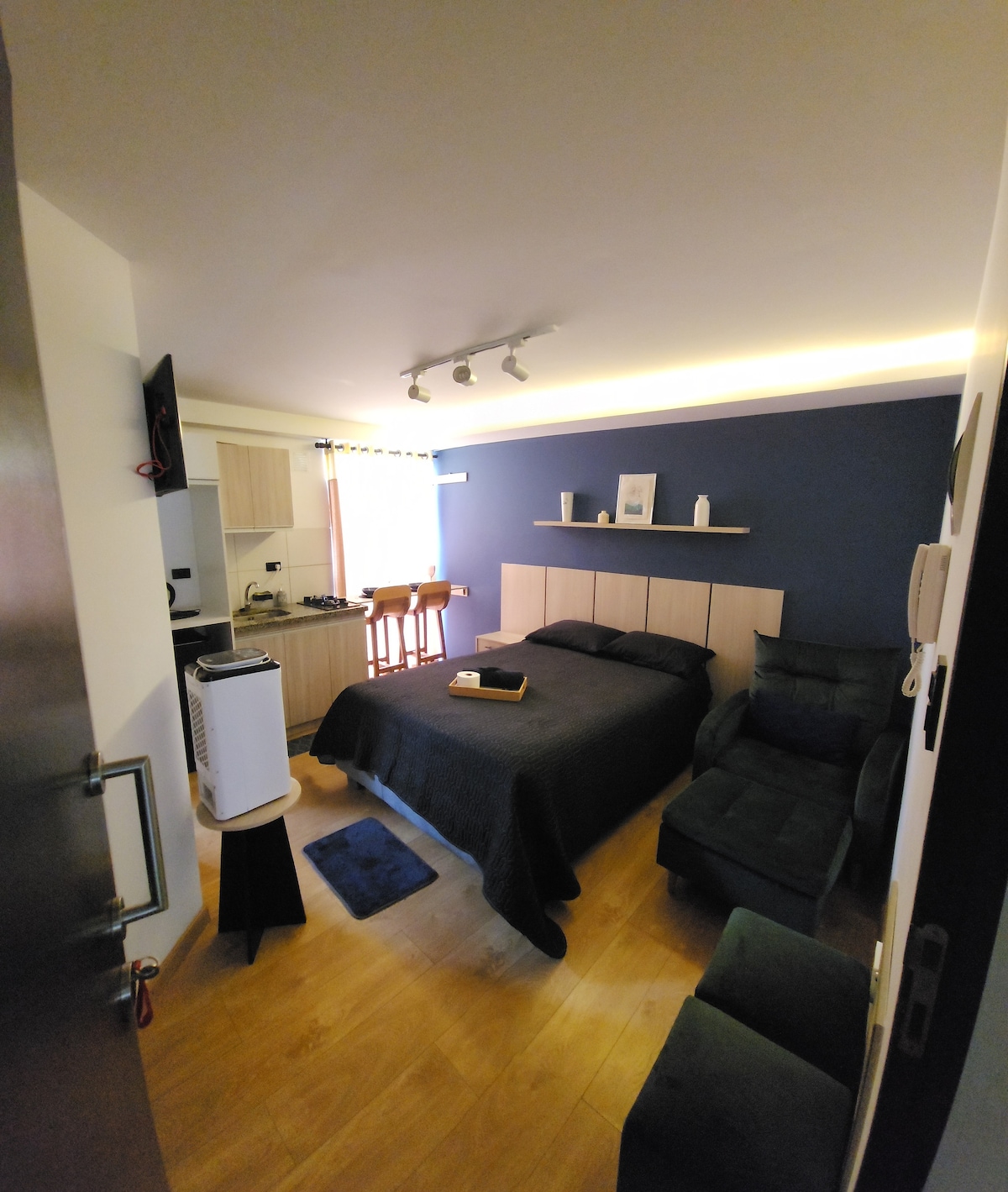 Desfrute do charme deste novo e moderno estúdio inteligente. Mobiliado e equipado com tudo o que precisa para tornar a sua estadia num momento agradável. Tem uma cama extra confortável, tamanho Queen, TV de 32 "e WIFI. Além de um frigorífico, cozinha, caldeira elétrica, mesa com duas cadeiras. Água quente 24/7 Desfrute deste ambiente confortável nas suas viagens de lazer ou negócios.