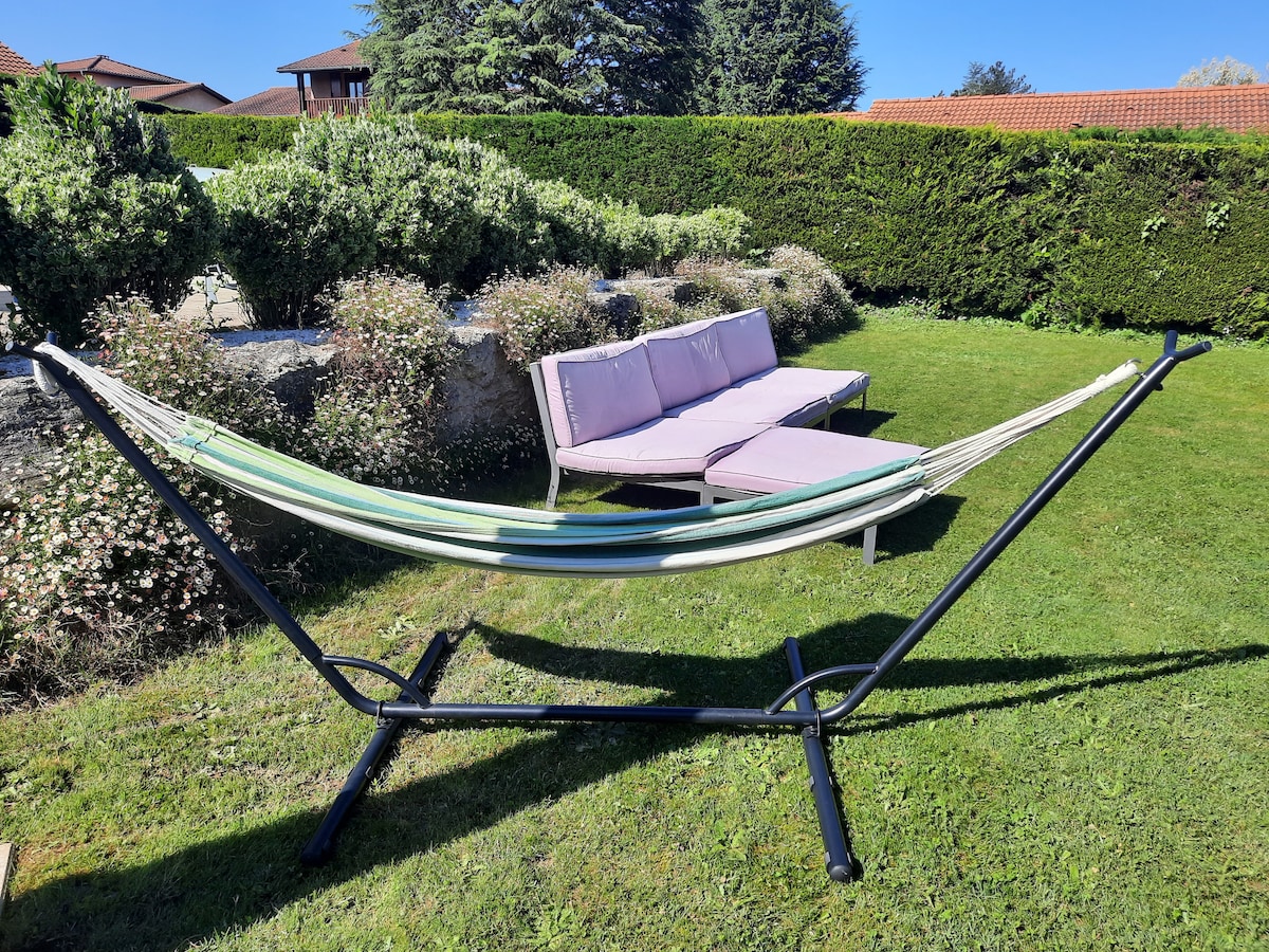 Passe uma estadia tranquila neste novo alojamento. Iluminado, vista para a natureza, amplo terraço e confortável (ar condicionado reversível, suíte master com chuveiro duplo, banheira jacuzzi, fogão, cama king size, pé direito alto, amplas janelas panorâmicas, etc...) A meio caminho entre o aeroporto de Lyon St Exupéry (20'), Eurexpo (20'), o centro da cidade de Lyon Bellecour (30'). Localizado nas alturas da aldeia, o ambiente é montanhoso e propício a pequenos passeios entre campos e floresta.