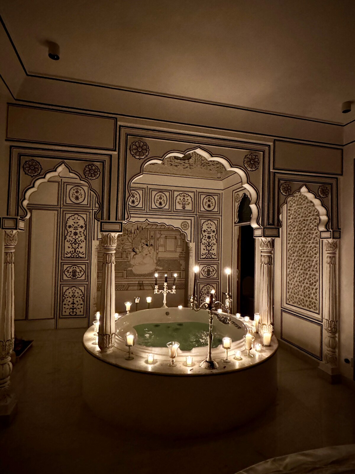 Entre num caderno de desenho vivo na Suite Princess by Lalluji Luxe. Reimaginada como um Sheesh Mahal 2D, esta suite monocromática apresenta paredes pintadas à mão e autêntico trabalho de espelho Tikari. Relaxe numa banheira de hidromassagem sob um teto "Sheesh Mahal" enquanto a realidade se dissolve. Saboreie refeições caseiras autênticas e relaxe na varanda artística. No Lalluji Luxe, não se fica apenas alojado, torna-se parte da obra-prima.