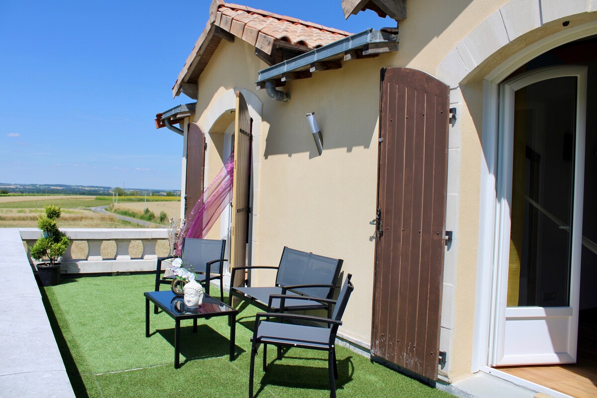 Ótima para famílias ou casais, a nossa casa está situada na bela zona rural de Charentais. Localização excelente para visitar lagos locais e praias ribeirinhas, cidades de mercado, Cognac, Bordéus, St Emilion, a costa...ou apenas relaxar! Oferecemos alojamento confortável num apartamento com dois pisos com vista para a piscina e para o jardim para o seu uso exclusivo.