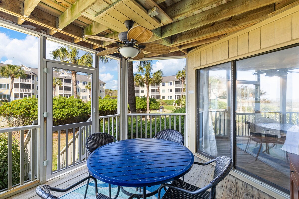 Vila Kiawah no segundo andar, perto da praia (menos de 3 minutos a pé) sem estradas para atravessar, perto de tudo. Atualizado. Perfeito para casais que procuram uma praia tranquila. Sofá-cama para crianças. Varanda coberta com vista para a floresta marítima. Observe os veados vagando e ouça os pássaros cantando. Ótima localização para uma corrida ao nascer do sol ou passeio na praia com uma xícara de café. Nosso apartamento pode acomodar confortavelmente 3 adultos, ou 2 adultos e 2 crianças de 12 anos ou menos.