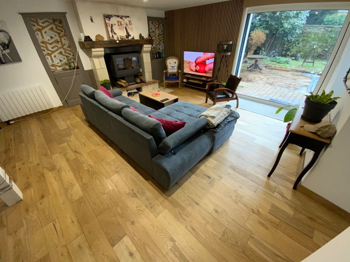 Casa virada para o sul em terreno totalmente cercado, a 20 minutos de Angers, e com todas as comodidades. É composta por uma área de estar de 60 m², 4 quartos (um no térreo), 2 banheiros e 2 toaletes separados. Você terá muitas comodidades para tornar a sua estadia agradável (berços, jacuzzi em serviço de 01/04 a 31/10, churrasqueira, jogos de tabuleiro, amplo terraço com pátio coberto, móveis de jardim, garagem para bicicletas, aparelhos para raclette, pedras quentes, panquecas...)