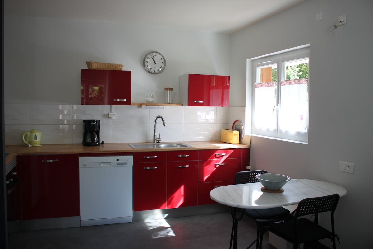 Estúdio muito agradável completamente remodelado numa residência segura e tranquila. Irá desfrutar de uma vista para o parque termal. O apartamento fica situado no 2º andar com acesso ao elevador. Está totalmente equipado com frigorífico, micro-ondas, forno, fogão, chaleira, cafeteira Dolce Gusto. A casa de banho, feita com bom gosto, tem um belo chuveiro com box. A área da cama é separada por uma parede baixa da área de estar, onde pode desfrutar de uma televisão com decodificador. Roupa de cama e toalhas fornecidas