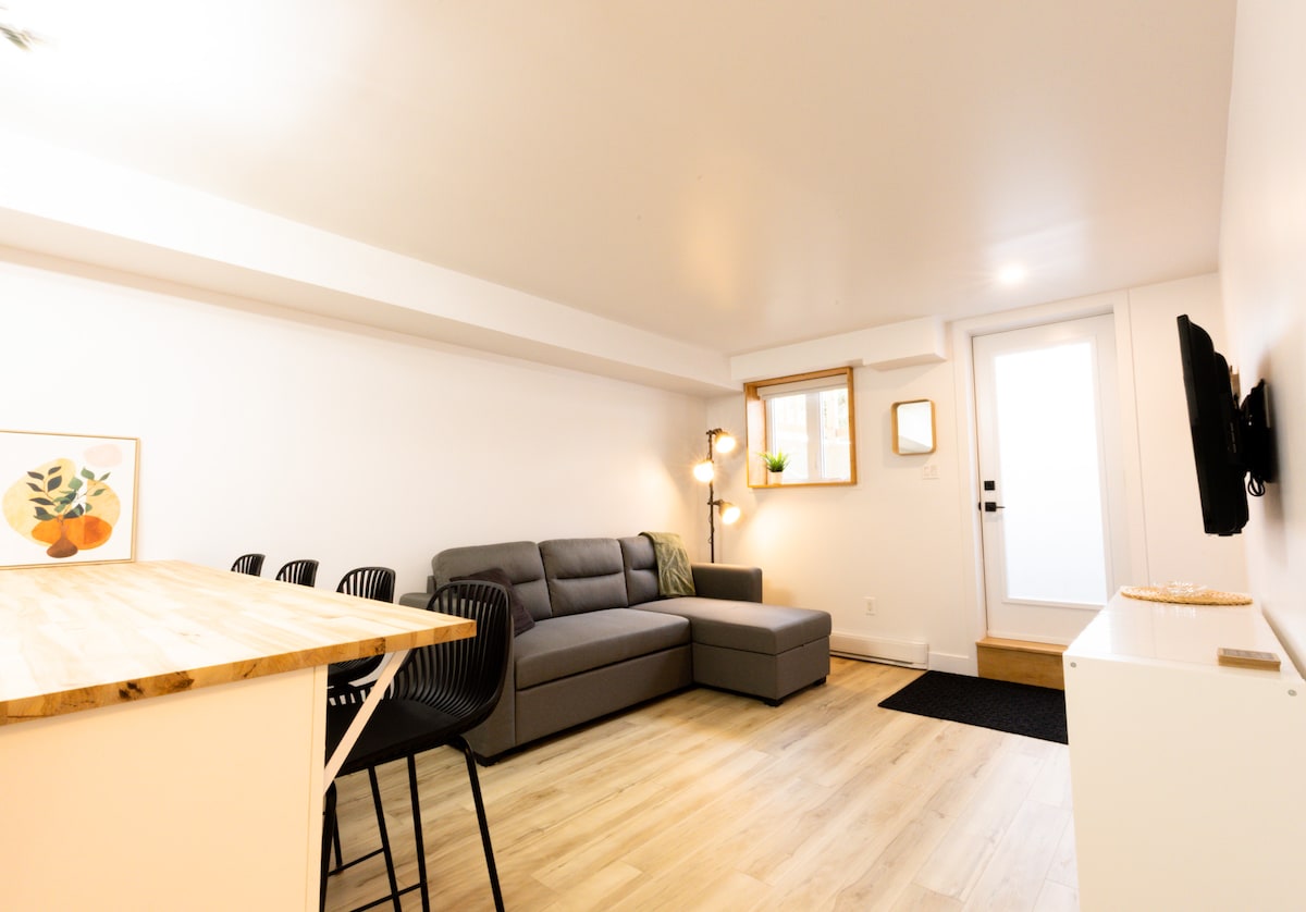Não são permitidas festas. Máximo de 6 pessoas. Bonito apartamento situado no 2.º andar. Vista única e acesso direto ao rio St. Lawrence. Espaço de conceito aberto com teto de catedral, incluindo cozinha, sala de jantar e sala de estar. 2 quartos com camas queen e 2 sofás que se convertem em camas individuais. Acesso partilhado a um miradouro, piscina aquecida, fogueiras, churrasqueira, etc. CITQ #310546 Outra unidade disponível no 1.º andar do mesmo edifício: airbnb.ca/h/petit-paradis-du-st-laurent