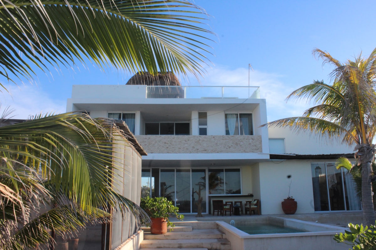 Casa com arquitetura elegante e 2 andares, além de um terraço no último andar. 3 quartos com vista para o mar e casa de banho completa privativa: 1 quarto no rés do chão e 2 quartos no 2.º andar. Piscina com vista para o oceano. O quintal tem muitas palmeiras. Descontos semanais e mensais. A limpeza está incluída. A 3 minutos do mercado de agricultores 3 minutos do Bistro Maasai A 4 min do Sayab Bistro A 5 minutos do ginásio A 5 minutos da Oxxo A 9 minutos do Café France A 10 min de Molusk. A 14 minutos da Isla Columpios A 15 minutos de Progreso