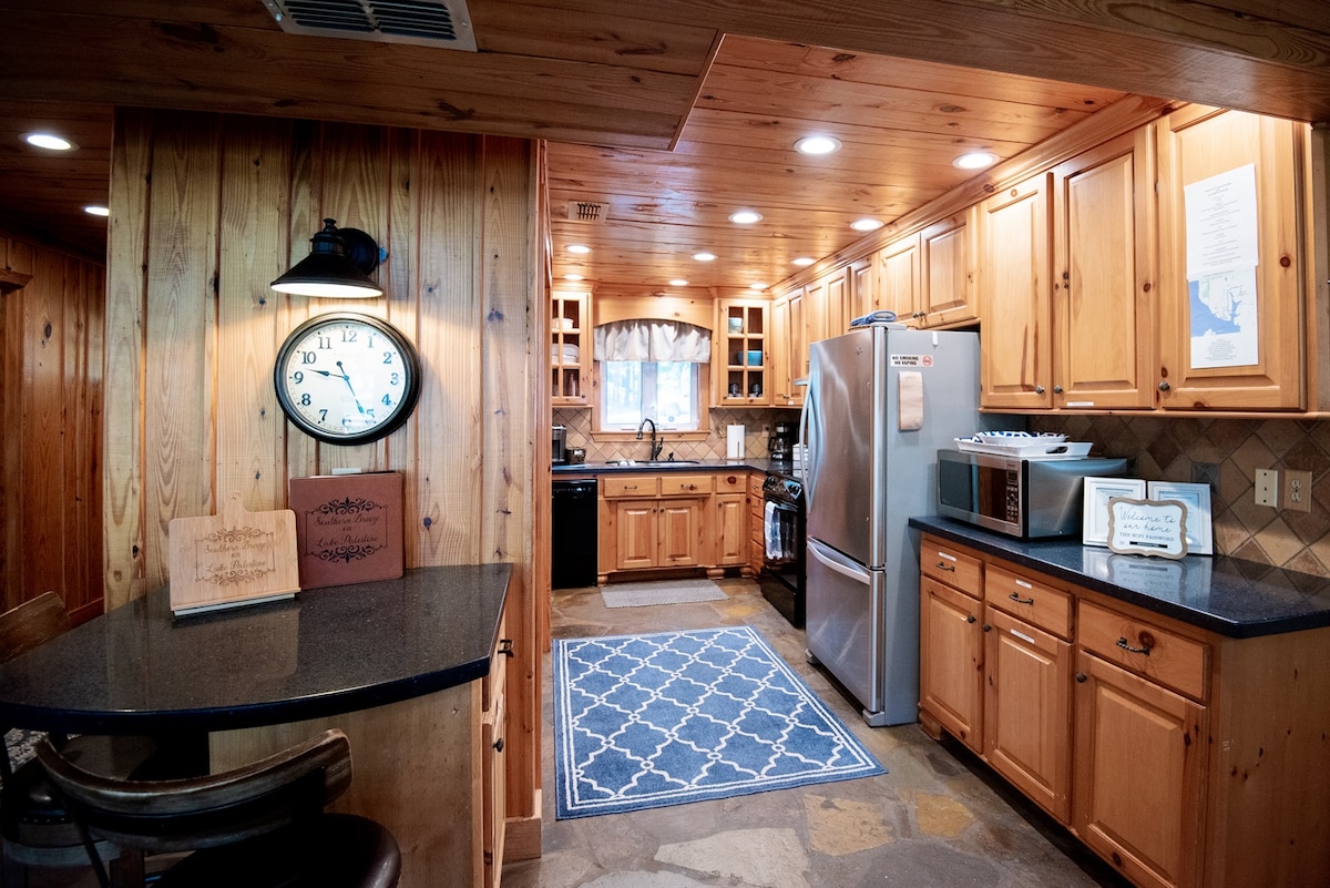 Relaxing waterfront cabin in a prime location on Lake Palestine. Come enjoy the East Texas pines, unwind around the fire pit, dine on the open deck or screened porch, and sit on the dock at sunset. Beautiful, updated home with large dining & entertaining spaces. Fully stocked kitchen with SS appliances and gorgeous granite counters. Plates, cookware, utensils all available. (Bed 1): King Bed (Bed 2): Queen Bed (Bed 3): 2 Sets of Bunk beds; Full on both bottom and twin (MAX 100lbs) on both top