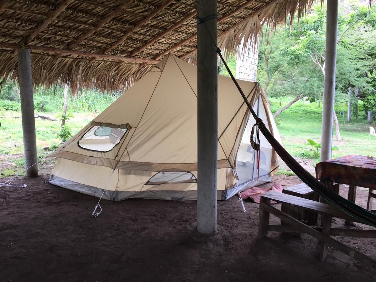 Parque de campismo coberto numa área arborizada com belas vistas, palapa privada, piso de madeira, instalação elétrica, iluminação e casas de banho ecológicas partilhadas para maior conforto. O preço inclui uma tenda para 2 pessoas equipada com um colchão matrimonial, lençóis, ventoinha, almofadas, toalhas e sabonetes por 500 $ cada espaço. O pagamento também inclui acesso a todas as instalações do espaço, como restaurante, casas de banho, chuveiros, rede de voleibol, redes, cadeiras de praia e cais.