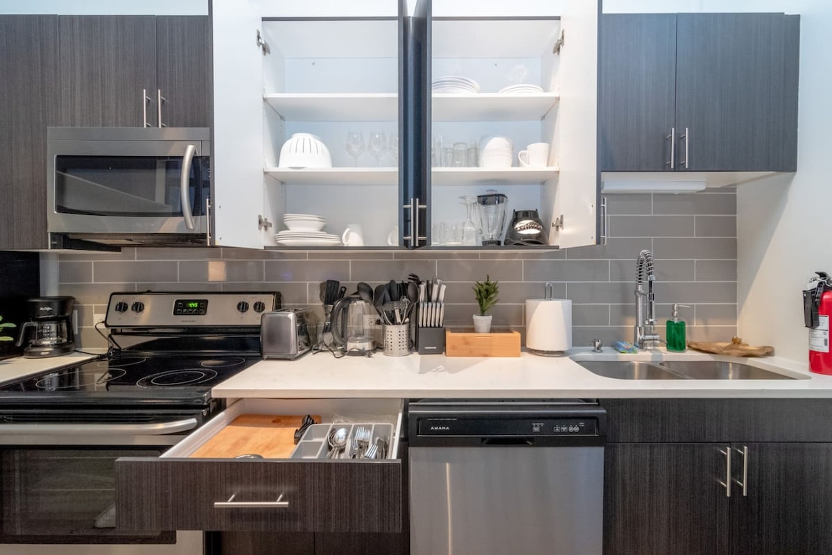 Descubra o nosso espaçoso loft moderno de dois níveis, perfeito para viajantes de negócios. Com tetos altos, janelas do chão ao teto e um terraço privado recentemente renovado com uma lareira. Localizado no coração de Restaurant Row, a apenas dois minutos do centro da cidade. Desfrute de uma estadia de luxo com um lugar de estacionamento dedicado incluído. Ideal para viajantes a solo ou casais que procuram um retiro urbano elegante.