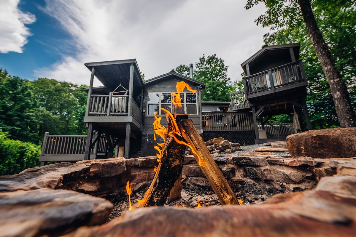 Retiro de luxo no topo da colina com banheira de hidromassagem e fogueira crepitante. 3 Suites King, 1 Quarto Queen, 1 Futon Queen, Cozinha do Chef, 10 camas. As famílias adoram a mesa de bilhar, os jogos de tabuleiro e o amplo quintal para as crianças explorarem. A cadeira alta e o PackNPlay estão prontos para os seus pequenos! A poucos minutos de caminhadas e restaurantes locais, regresse a casa para um s'mores ao pôr-do-sol à volta da fogueira. Reserve agora para garantir as suas datas! Chimney Rock e o Parque Estadual de Chimney Rock estão ABERTOS! O lago estará aberto novamente em maio de 2026!