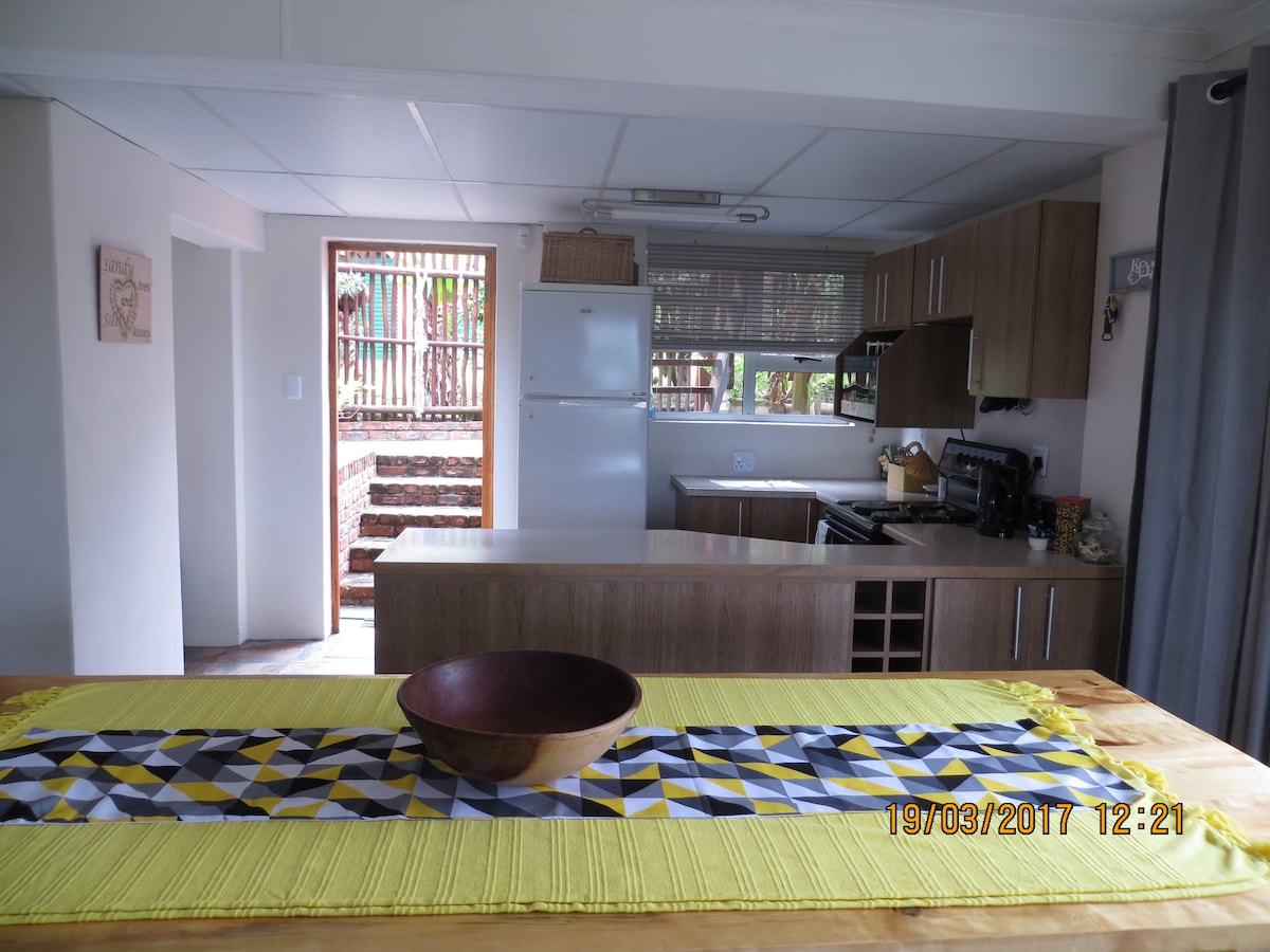 Belas vistas para o mar e um espaço maravilhoso para relaxar com a família e os amigos a apenas 5 minutos a pé da praia. A casa acomoda 6 pessoas confortavelmente e está totalmente equipada. Dstv completo, Wi-Fi limitado e um inversor. Tem uma piscina comunitária, quadra de tênis e parque infantil e um calçadão com vista para o mar. As atividades na área são os Big 5, passeios de jogo, golfe, degustação de cerveja, passeios a cavalo, rapel, caiaque, pesca, caminhadas, surfe, praias deslumbrantes e ótimos restaurantes.
