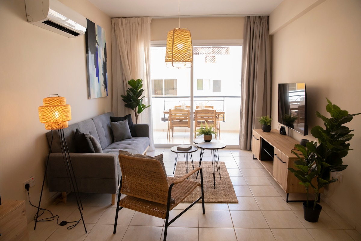 Desfrute de uma vida elegante com vista para o mar! 🌊✨ O nosso apartamento luminoso e moderno oferece um ambiente tranquilo com materiais naturais e toques quentes. Pôr do sol deslumbrante a partir da varanda. Uma cozinha totalmente equipada, 2 quartos acolhedores com camas de casal e a piscina partilhada garantem o mais alto nível de conforto. Perfeito para o seu relaxamento e aventura – o seu lugar agradável em Chipre! A praia fica a apenas 10 minutos a pé – perfeita para dias relaxantes à beira-mar.