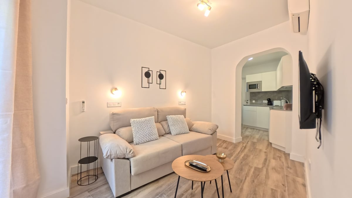 O apartamento todo exterior e muito luminoso está localizado na Calle Mayor, mesmo em frente a uma das entradas para a Plaza. Móveis e eletrodomésticos . É composto por: Quarto, cozinha, sala de estar, todos integrados num quarto individual, com ar condicionado e aquecimento, e para além da casa de banho. A cozinha está totalmente equipada. a área de estar é composta por um sofá-cama 140,TV, IPOD e lareira decorativa, depois há a área do quarto composta por 2 camas de 1,90x90 e um guarda-roupa.