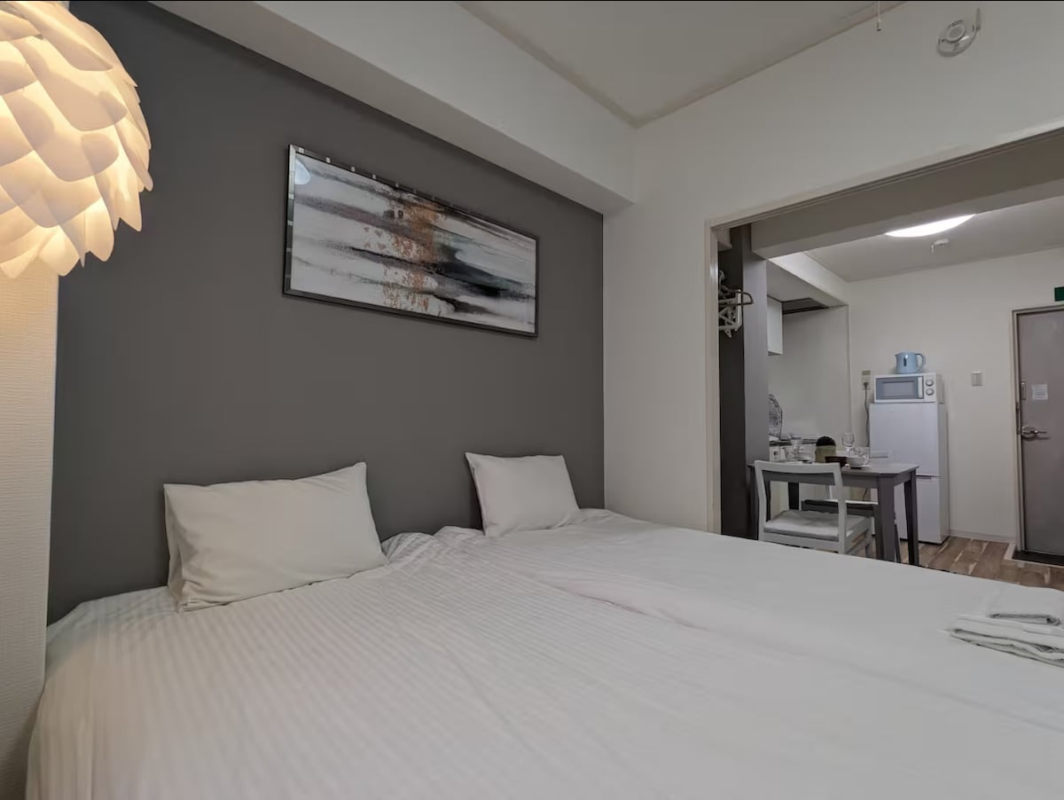 [Desconto para estadias prolongadas] Quarto duplo de estilo ocidental | A 10 minutos da estação de Sannomiya, em Kobe | Equipado com Wi-Fi, TV e máquina de lavar roupa | Com cozinha | Para 3 pessoas