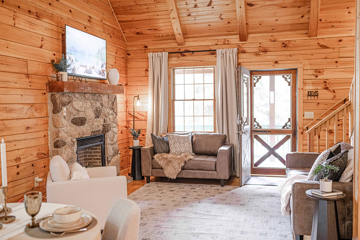 Suíte de hóspedes acolhedora anexada à casa principal em uma vila de cabanas de madeira. Cozinha completa, área de jantar, fogão a lenha, cama queen size confortável, closet, jogos, 100 filmes. Chuveiro com box e assento embutido. Lavanderia com porta para área do convés, mesas de bistrô, lareira. A sala de estar abobadada tem um assento de amor para um dorminhoco, TV [ROKU, You Tube TV, HULU, Netflix, Amazon, Disney], leitor de Blu-Ray e Google Nest Mini. Desfrute de itens de café da manhã como ovos frescos, suco, leite, pão, café, chá e nossa pizzelle caseira.