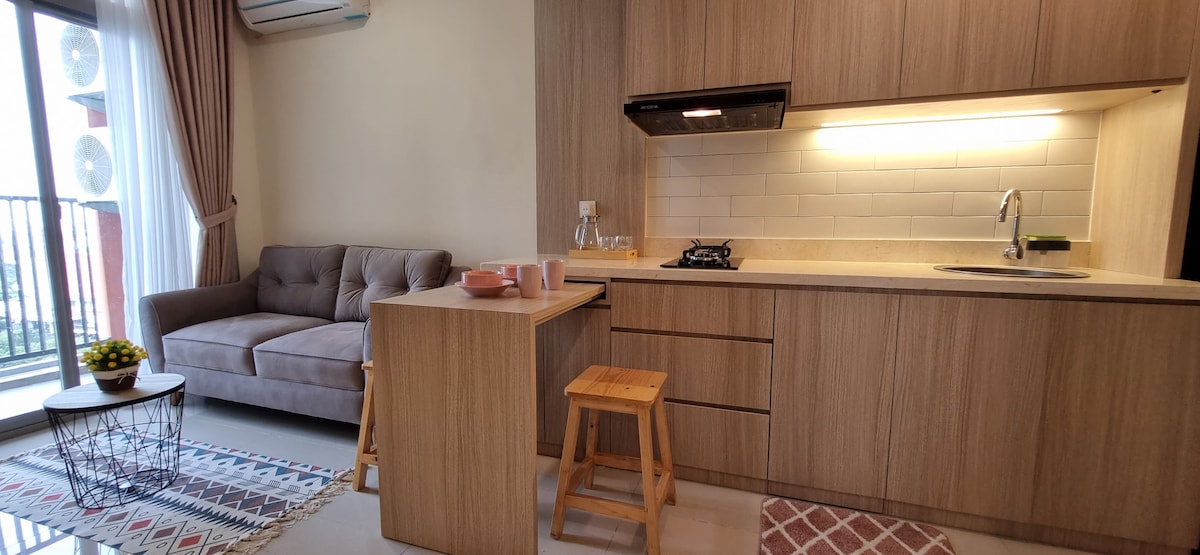 Relaxe neste apartamento acolhedor de 3 quartos que acomoda até 5 hóspedes, completo com 2 casas de banho, uma cozinha totalmente equipada e toques artísticos e acolhedores em todo o espaço. Acorde com vistas relaxantes para a piscina olímpica, a poucos passos de distância para um mergulho refrescante. Localizado no sul de Jacarta, o alojamento está diretamente ligado a um centro comercial cheio de opções de refeições, com mercearias e lojas de conveniência no próprio edifício. O melhor de tudo é que está ligado ao MRT Lebak Bulus através de uma ponte aérea, tornando as viagens pela cidade muito fáceis.