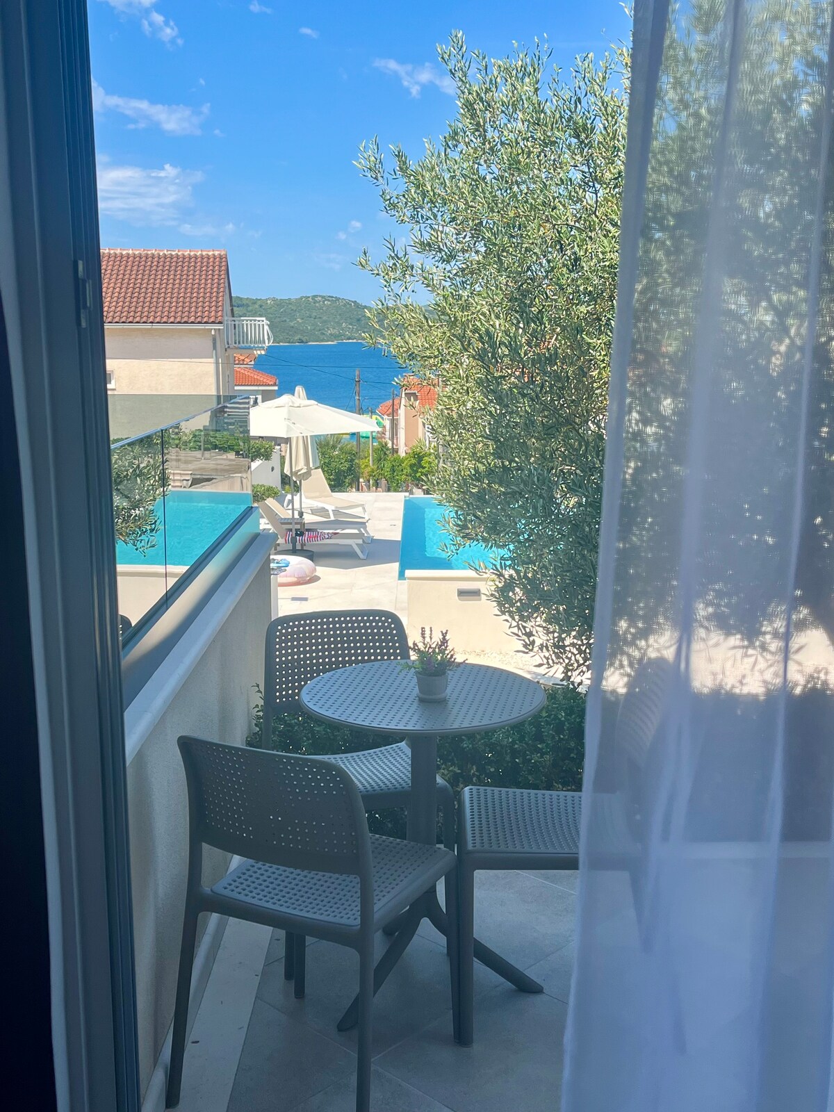 Casa Neda, belo apartamento com vista para o mar e terraço espaçoso (50m2) que é apenas para seu uso privado e relaxamento! O apartamento tem dois quartos. O quarto A tem cama queen size, o quarto B tem duas camas de solteiro. Cozinha totalmente equipada com tudo o que você pode precisar e é nova em folha. Nosso apartamento fica no bairro tranquilo e a apenas 150 metros da praia mais próxima. A casa está cercada por floresta e oferece tudo o que você precisa para férias e relaxamento perfeitos.