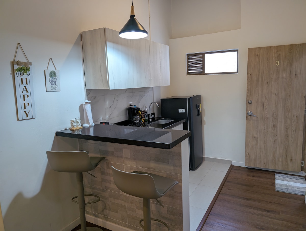 Estúdio elegantemente decorado e o melhor conforto para os nossos visitantes. Localizado no coração do modelo, perto do terminal de transportes, Aeropuerto, supermercados, restaurantes, bancos e da área rosa. Não contamos com elevador. COMODIDADES INCLUÍDAS Ginásio. Terraço Um parque infantil Pequeno-almoço incluído das 7h às 9h Segunda-feira - Sábado, não aos domingos ou feriados. SERVIÇOS COM UMA TAXA ADICIONAL Sala de Reunião Mini bar 2 parques de estacionamento nas proximidades, localizados a dois quarteirões do edifício. Não contamos com acordo