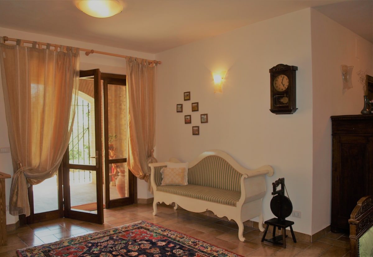 É um anexo de 60 metros quadrados adequado para casais que desejam visitar a nossa região. Não temos piscina, mas temos a tartufaia, o riacho, os cervos, porcos-espinhos, javalis, nossos gatos e a cachorrinha Moti. No jardim você encontrará ervas, frutas e produtos da horta. Dentro da casa que alugamos, você terá à sua disposição o nosso azeite e o licor de helichriso que produzimos. Na verdade, também produzimos açafrão, mas este é vendido! Os animais são muito bem-vindos!