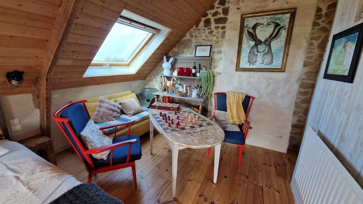 Casa de campo incomum e artística, a casa das lebres a 5 minutos das praias de areia e esportes aquáticos A 15 minutos de Roscoff, talassoterapia, ilha de BATZ Embarque para a ilha de Batz Inglaterra Irlanda Antigo edifício de pedra reformado ecologicamente, com isolamento de cal/cânhamo, paredes de argila e madeira, aquecimento a granulados Estúdio para 2 pessoas no andar de cima do celeiro, com todo o conforto, fogão vitrocerâmico, forno tradicional e micro-ondas, chuveiro italiano, banheiro separado, cama de 160 x 200 cm Tomada para veículos elétricos