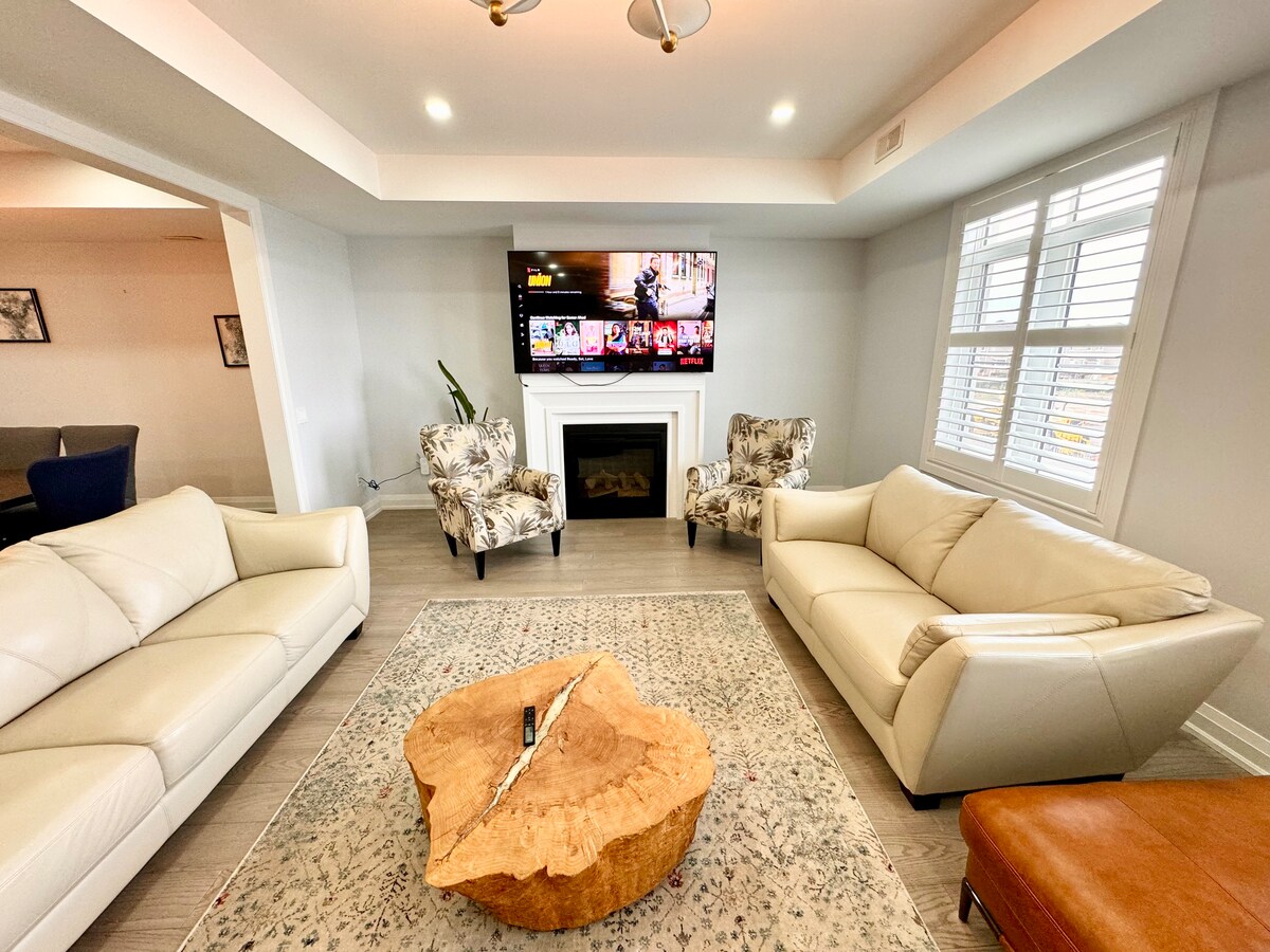 Totalmente renovado, moderno, luminoso, luxuoso e espaçoso (mais de 1800 pés quadrados) apartamento de 2 quartos, 2 banheiros de teto alto acima do solo, entrada separada e pátio para sua próxima casa aconchegante longe de casa! Avaliado com 5 estrelas e top 5% das acomodações no AirBnB! O mais central possível na GTA. Você estará perto do Aeroporto Pearson, da Rodovia 401/404/407, de shoppings, mercearias e uma variedade de restaurantes da moda, cinemas, parques e trilhas de bicicleta/caminhada ao redor Reserve com confiança!
