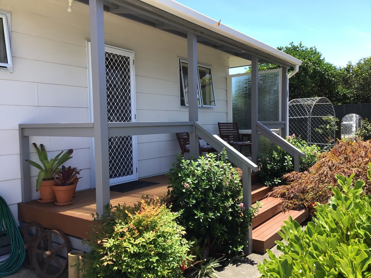 Construído em 2015 como um apartamento de avó com cozinha acoplada e banheiro privativo, incluindo excelente chuveiro aquecido a gás. Espaçoso e separado da casa principal, muito privativo. Pode facilmente acomodar dois adultos mais 1 criança sem nenhum custo extra (cama queen size + sofá). Estacionamento próprio, pia de cozinha ao ar livre com água quente/fria. Torradeira, micro-ondas, frigideira elétrica, churrasqueira pequena disponível. Wi-Fi ilimitado. Acesso à máquina de lavar roupa. Chá e café de cortesia. ** N.B. não há fogão ou pia de cozinha dentro da habitação. **