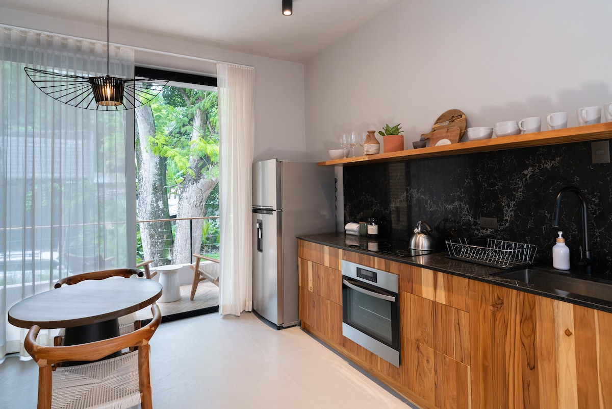 Projetada em um estilo minimalista que só pode ser descrito como contemporâneo-encontra-boêmio, esta suíte estúdio é um refúgio moderno na praia. Situado no coração de Santa Teresa, você estará a apenas 3 minutos a pé das melhores praias e a poucos passos de dezenas dos restaurantes mais badalados da região. Esta estrutura recém-construída foi construída para fornecer a você os elementos de um resort de luxo moderno, proporcionando a você a privacidade de seu próprio retiro privado na selva.