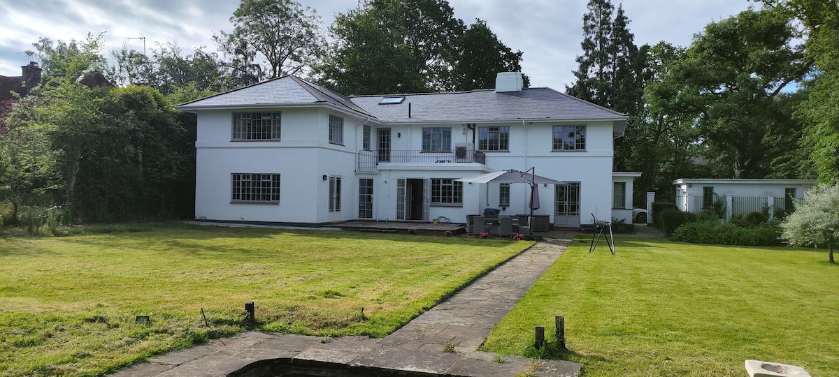 Delightful detached barn crafted from French oak in a peaceful private lane on a gated country estate. Luxuriously appointed with full facilities for a short break or longer stay. Air Con. Free EV charging point. Many public footpaths close by. Local shops are only a 10 minutes stroll. Gastro pubs, restaurants and independent shops within easy walking distance. A short drive from M25 (J11). Fast rail links to London from Woking. LGBTQ+ friendly. Friendly Spaniel and Siamese cat on site.