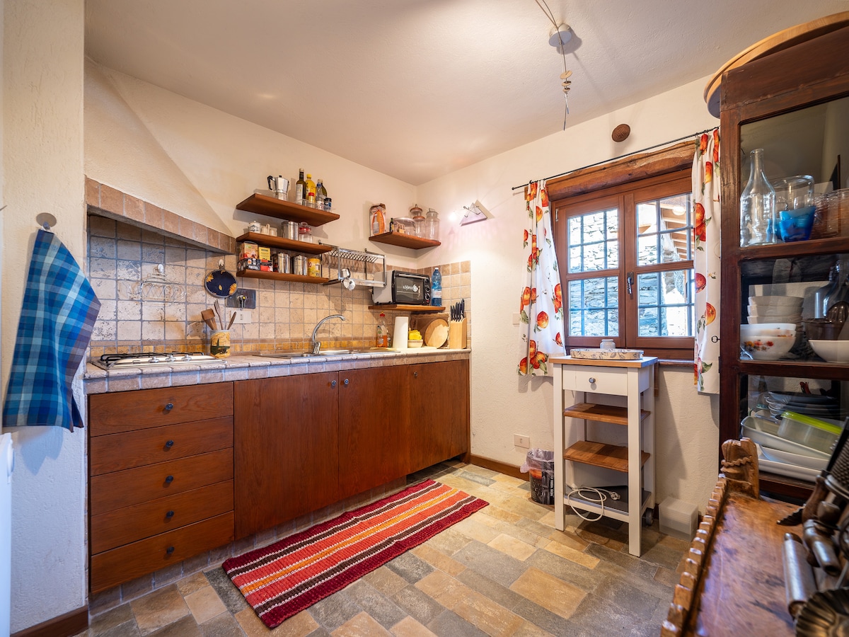 Casa independente em pedra, decorada com objetos da tradição local e lembranças de família. Os espaços estão organizados em dois andares: abaixo da sala de jantar, o banheiro de serviço, a cozinha e a sala de estar com lareira; no mezanino, a pequena biblioteca com duas poltronas confortáveis; finalmente, acima do banheiro com chuveiro, o quarto de casal, o quarto com beliches e, finalmente, o quarto com duas camas de solteiro. O ponto forte da casa é o grande jardim com vista para as montanhas.