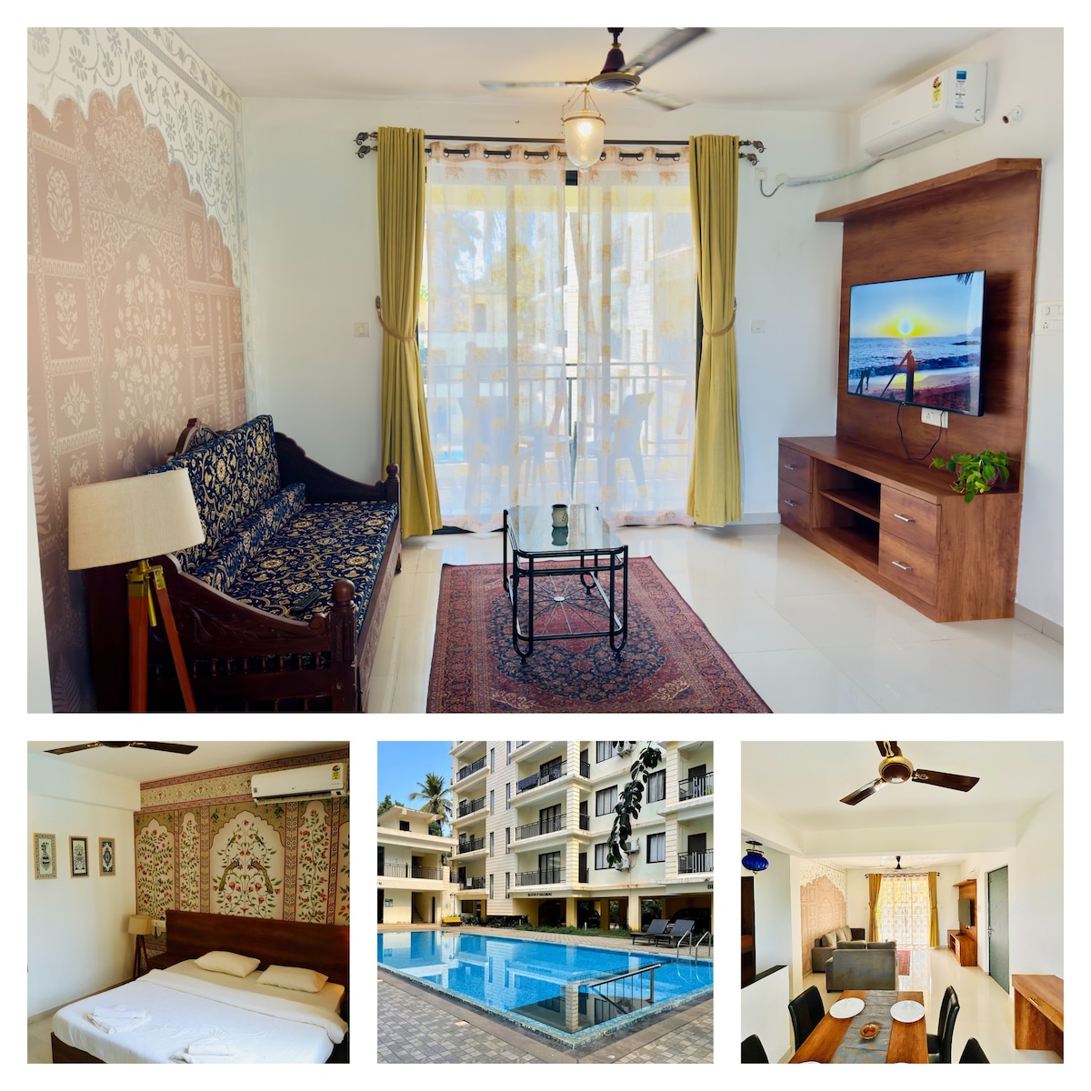 Fuja para o seu refúgio tropical privado no coração de Calangute. Tenha em atenção: * A piscina de imersão é totalmente pessoal e privada, ligada ao quarto com uma bela vista para as palmeiras de Goa (não é um jacuzzi ou banheira de hidromassagem). * Os hóspedes também têm acesso a uma piscina partilhada no terraço (das 8h00 às 20h00), perfeita para mergulhos ao pôr do sol. * Energia de reserva disponível para luzes, ventoinhas, Wi-Fi e carregamento.