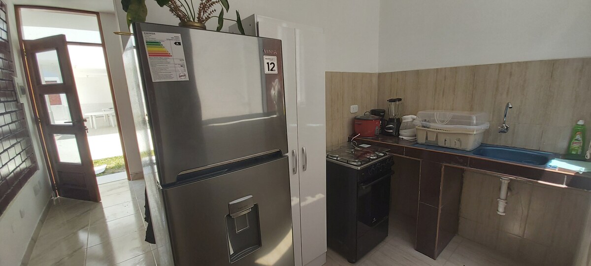 Casa independiente para 8 personas con agua, luz, 3 baños completos con agua caliente, Menaje para 8 personas, cocina, refrigeradora, microondas , licuadora, 4 habitaciones: 1 matrimonial con baño y 3 cuartos con literas. 3 baños más. Cuenta con una amplia terraza, parrilla y hamaca. Además cuenta con sala comedor integrados. Hay lavandería con lavadora y tendal de ropa. La cochera está frente a la casa. La casa se encuentra en la avenida costanera, segunda fila.