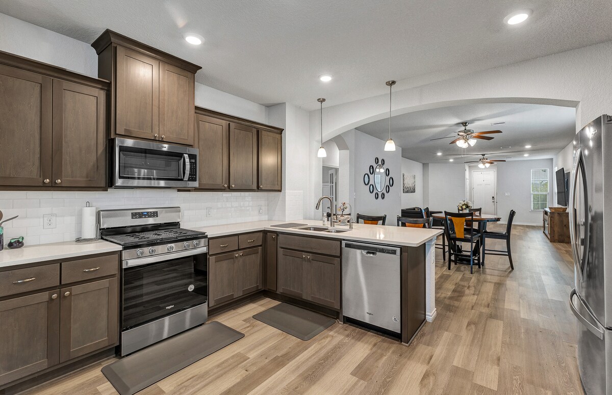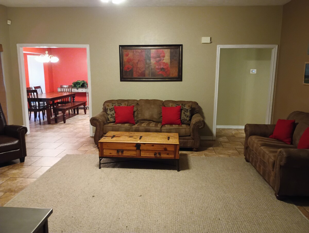 Linda casa personalizada de 4 camas e 2 banheiros com muito espaço para relaxar com a família ou seu grupo. Elegante porta de carvalho de grandes dimensões se abre para um grande espaço de estar com tela plana de 65 polegadas e tetos altos e muito espaço para se espalhar. O quarto principal é uma verdadeira suíte presidencial. Quintal enorme com pátio coberto de 300 pés quadrados na parte de trás com tela plana de 60 polegadas e muitos jogos - pingue-pongue, pebolim, dardos, lavadoras, cornhole. Cozinha gourmet, enorme área de estar com móveis de couro, lareira e plano de piso aberto.