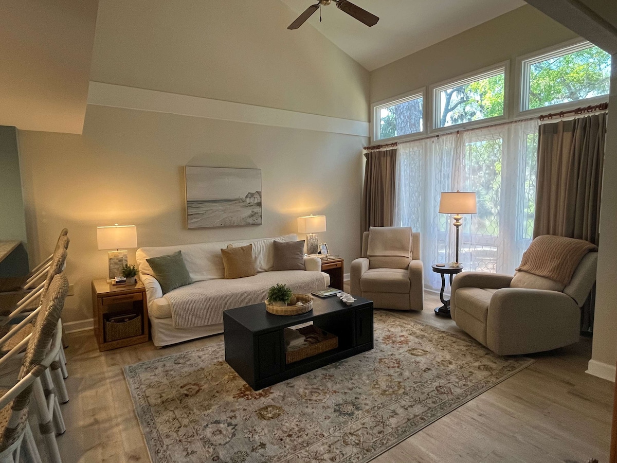 Vida de resort ao longo da lagoa, palmeiras e campos de golfe exuberantes. Apartamento privado num resort em Edisto Beach, no Wyndam Ocean Ridge Golf/Resort de lazer. Moradia geminada Club Cottage. A 5 minutos de carro ou a 5 minutos de bicicleta da praia. A 15-30 minutos a pé da praia. Fornecemos camas confortáveis e roupa de cama/toalhas. O resort tem 3 piscinas, minigolfe, parque infantil, ténis e pickleball. Os destaques incluem trilhos para bicicletas, pôr-do-sol na enseada de St. Helena, resort fechado, praias vazias, desportos aquáticos, passeios de pesca, apanha de caranguejos e golfe.