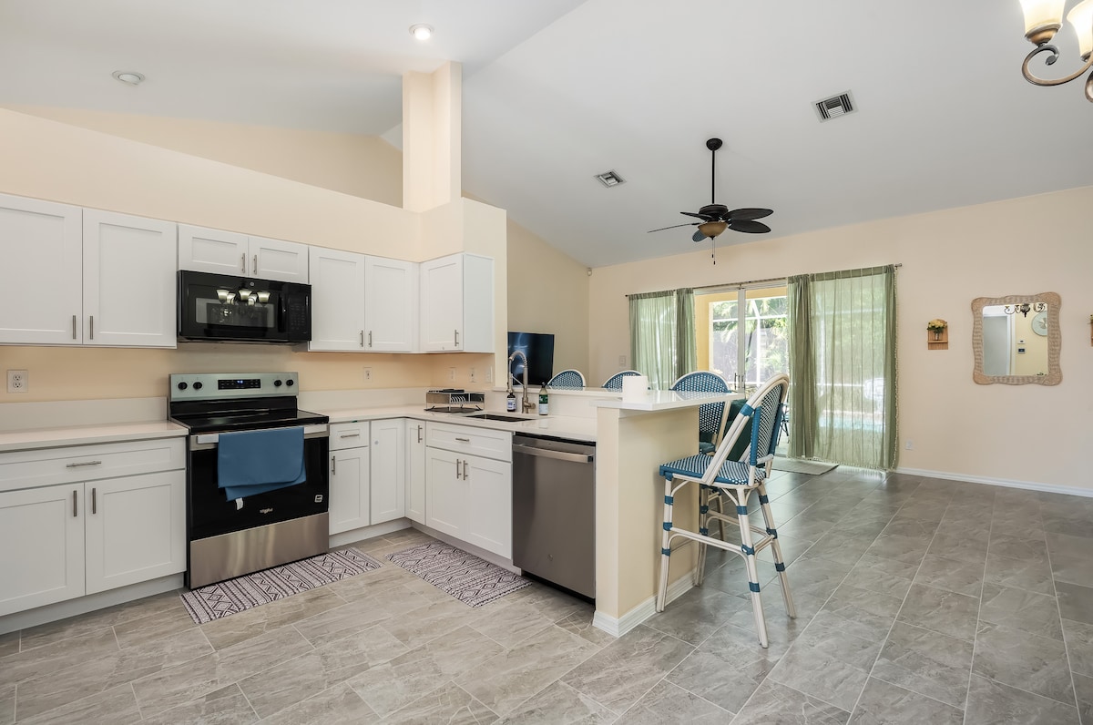 Welcome to SALT + LIGHT! Family owned + updated with new porcelain tile, stainless appliances, quartz countertops, + new A/C! A+ Location: 3m-Downtown 3m-Tin City 4m-Beach 5m-Naples Zoo 5m-Botanical Garden 5m-Great Wolf Lodge Highlights: Private Heated Pool (no extra charges) Covered Lanai w/String Lights Fire Pit Beach Gear Keyless Entry Game Room Beachy Wall Mural Outdoor Shower Washer/Dryer Workspace Bunk Beds High-Speed Wi-Fi+Smart TVs Medical-Grade Air Purifier Gym, Pickleball + Sauna