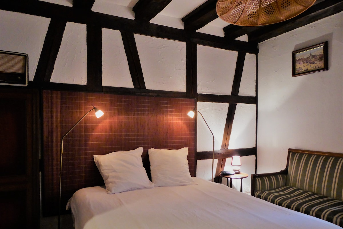 A poucos passos da ponte da pequena Veneza, a casa está localizada em uma pequena rua muito tranquila no bairro dos barqueiros, no coração do centro histórico da cidade de Colmar. Localização ideal para visitar Colmar a pé! Deixe-se encantar pelo estilo antigo da casa, sua rusticidade e autenticidade! Você tem um quarto/sala de estar de 28 m² e, passando por um patamar comum com Anne Marie, a gerente, você acessa a cozinha e o banheiro privativo.