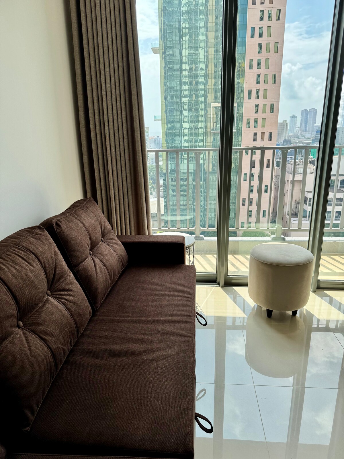 Bem-vindo ao Abeys Sky Residence no Tri-Zen, que oferece vistas deslumbrantes da Lotus Tower no coração de Colombo 02. Este apartamento moderno com um quarto tem uma cama queen, um sofá-cama confortável, uma sala de estar totalmente climatizada, uma cozinha equipada, uma casa de banho com água quente e comodidades de lavandaria. Os hóspedes também têm acesso à piscina, ao ginásio, à área de lazer infantil e ao espaço de coworking no último piso. A poucos passos de lojas, restaurantes e transportes, ideal para estadias de negócios e lazer.