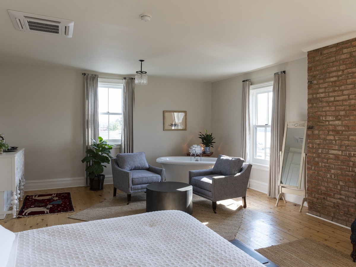 At The Hudson Whaler Hotel, we are located on Warren Street giving guests easy access to all of the shops, cafes and restaurants. We have 16 suites all with en-suite bathrooms, lux bedding, coffee, mini fridge, safe and hair dryer. Amenities includes soap, shampoo, conditioner and plenty of towels. Room configurations and prices vary. This Deluxe King Suite offers a king bed, queen sofa bed. Bathroom includes a deep soaking tub and a shower.
