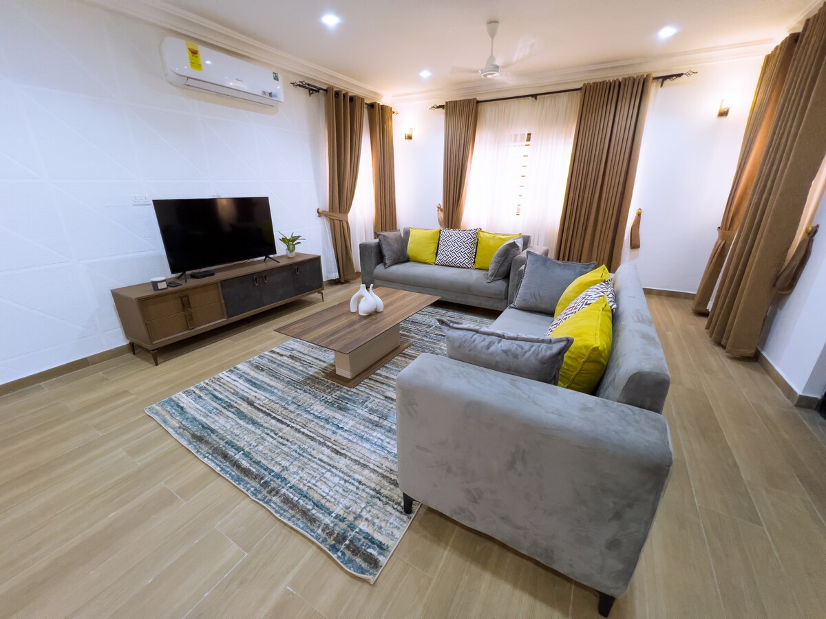 1. A segurança é um fator principal na sua escolha de alojamento? 2. Está à procura de um alojamento elegante com comodidades incríveis e toques atenciosos? 3. Quer ter uma hospitalidade excecional durante a sua estadia? Em seguida, a Serene Haven é a escolha perfeita para si. Esta bela casa de dois quartos está localizada dentro do ambiente sereno de Devtraco Courts (uma propriedade fechada bem planeada e gerida) na Comunidade 25, Tema, que abriga muitos profissionais e se orgulha de segurança 24/7.