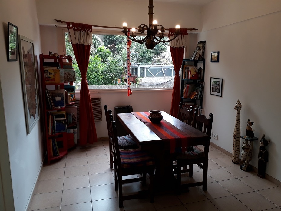 Departamento de dos ambientes, muy luminoso, silencioso, con vista a espacios verdes y en pleno centro de San Telmo. A cuatro cuadras de Puerto Madero, a 4 cuadras de Plaza de Mayo y Florida. Wifi, aire acondicionado (2), estufa, bibliotecas, dormitorio aparte con cama King Size, TV, Directv, Netflix y aparte otro colchón de una plaza. Cocina completa con heladera con frezzer, microondas y cafetera. Baño completo con tina.