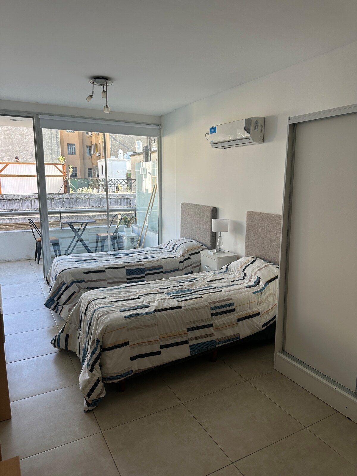 It is a luminous interior studio apartment of 28 m2, located in a new building and in one of the most central areas of the city, ideal for getting to know Buenos Aires on foot. It has a 43" smart TV, high-speed internet , a double bed ( of high quality) or 2 separate ones (0.80cm wide, 1.90m long) at the guest's choice, hot/cold air conditioning, safe, spacious, and modern bathroom. The building has solarium, gym and laundry.