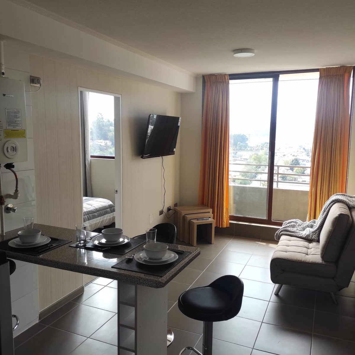 Apartamento novo, central, confortável, limpo, seguro, moderno, mobiliado, dois ambientes, equipado para 3 pessoas, composto por um quarto com cama de casal de 2 lugares e um sofá-cama. Também tem TV a cabo, Wi-Fi, terraço, aquecimento, churrasqueira elétrica, academia, concierge 24 horas, estacionamento, lavanderia (máquinas de lavar e secar) locomoção até a porta, perto de supermercados e universidades, centro de Concepción, localizado em frente ao estádio Collao, a poucos passos do terminal Collao