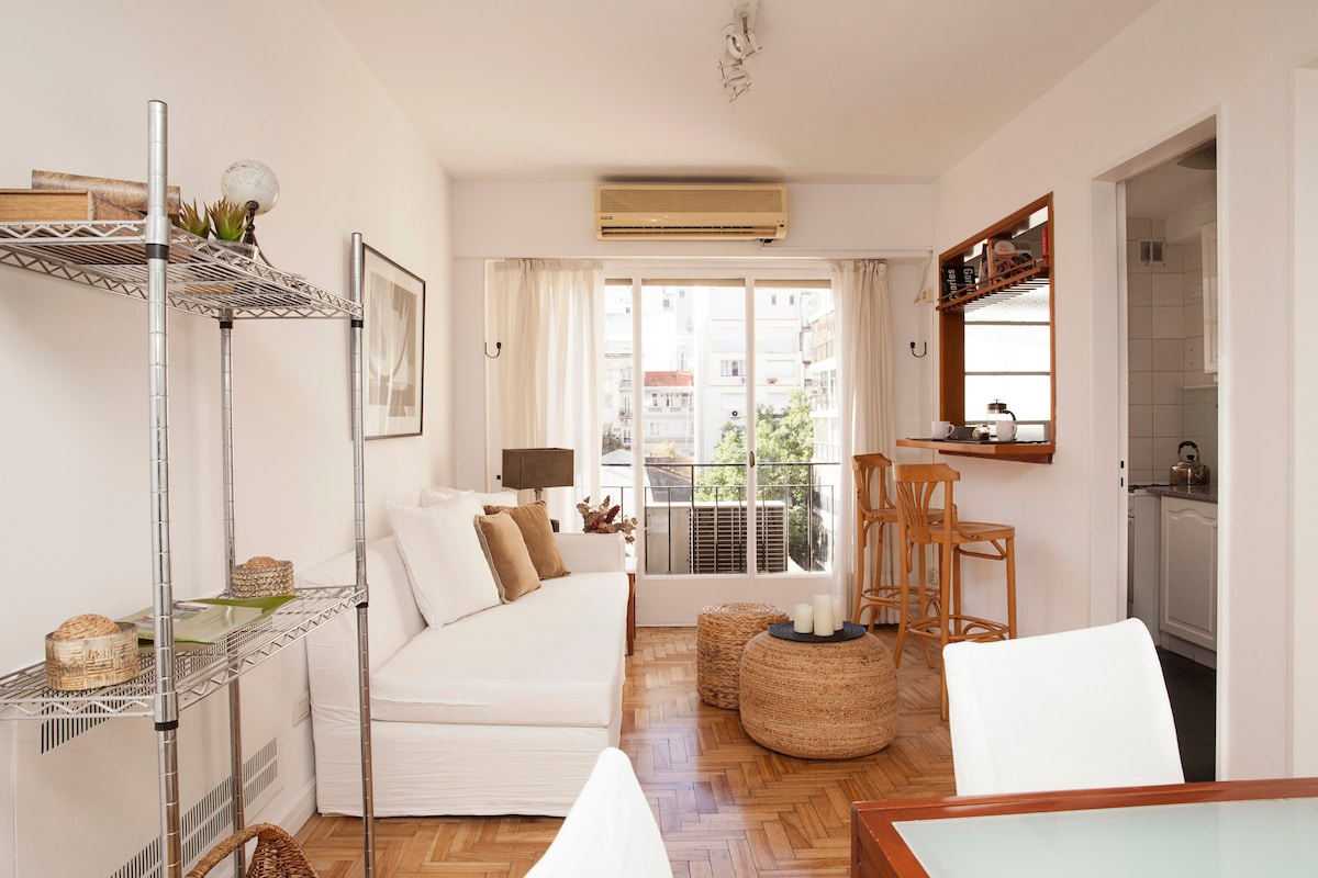 Elegant and fully equipped 100 m² apartment located in the very heart of Recoleta. Thoughtfully designed with two comfortable bedrooms, a spacious living and dining area, one full bathroom and a guest toilet. Quiet garden views, excellent building, an unbeatable location just steps from Recoleta’s best cafés, parks, museums and public transportation make this apartment a refined and comfortable choice for your stay in Buenos Aires