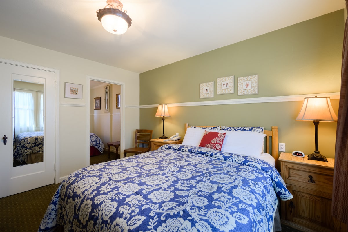 Este quarto lindamente decorado abre-se para o nosso pátio repleto de flores 🌸 e dispõe de duas camas de casal extra-longas 🛏️🛏️ (queen-size). Localizado num pequeno motel familiar no bairro de Marina, perto de lojas e restaurantes de 🏙️ Cow Hollow e Chestnut Street. Desfrute do bairro onde é possível ir a pé e de uma estadia acolhedora. Estacionamento 🚗 gratuito mediante disponibilidade. Verifique com a receção. 🐾 Não são adequados para animais de estimação. Ocupação 👥 máxima: 4 hóspedes. Esperamos poder dar as boas-vindas! 😊
