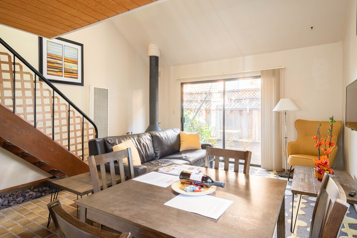 Charmoso, estilo loft, com quarto e banheiro no andar de cima, sala de estar e cozinha no andar de baixo. O quarto, com uma cama tamanho queen, está em um loft com vista para a sala de estar. O sofá de couro no andar de baixo se converte em um segundo dormitório tamanho Queen. VAGA DE ESTACIONAMENTO RESERVADA DENTRO DO PÁTIO SEGURO E FECHADO - BEM AO LADO DA SUA PORTA DA FRENTE.