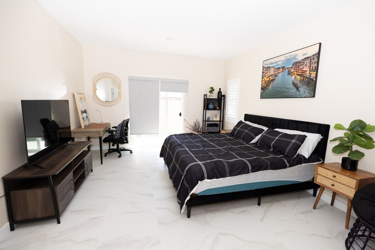 Design refresh in progress! Our studio has all you need for a wonderful vacation as a solo traveler or with a loved one. This is a brand-new guesthouse with two other units on the property, both available to book on Airbnb. Built with love and care, indulge in the luxury of a roomy walk-in closet, a refreshing en-suite bathroom, and a well-stocked kitchen. There is also a combo washer/dryer for your convenience.